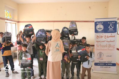 توزيع الحقائب المدرسية لطلاب وطالبات مدرسة المنار – وادي أحمد بمديرية بني الحارث .